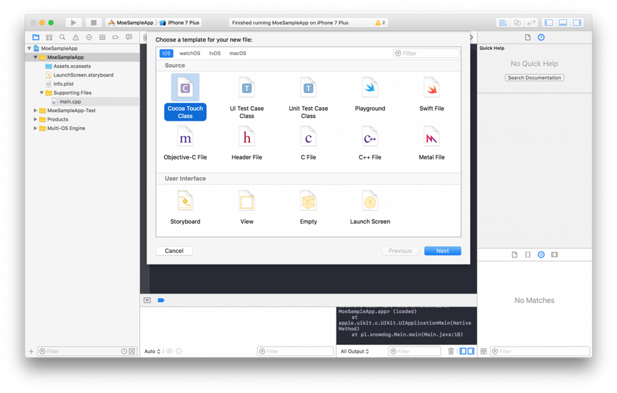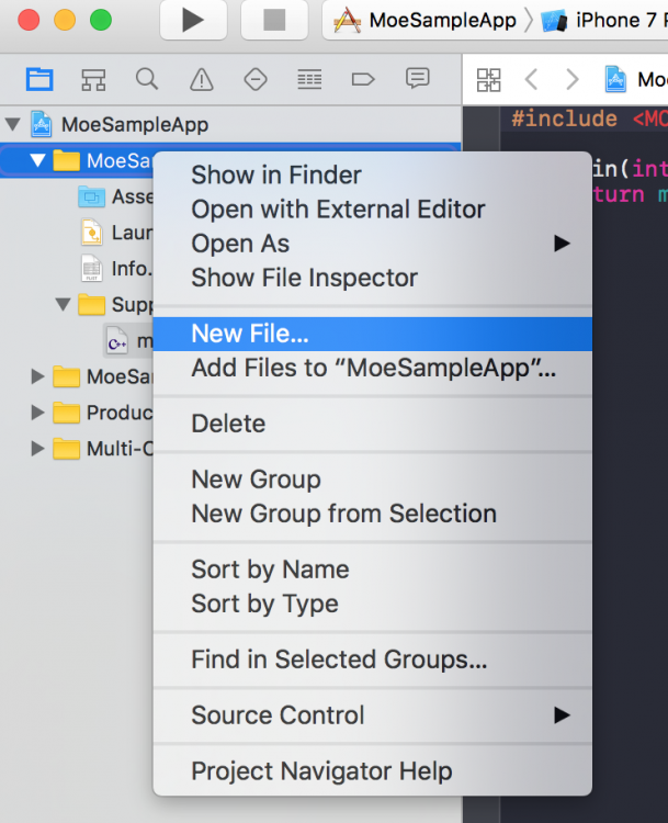 3. When Xcode will be started click on MoeSampleApp and select New file