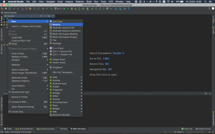 Before you start working on MOE application you should check prerequisites. You can find them in documentation. Next you need to add MOE plugin to Android Studio. Go to Android Studio → Preferences → Plugins and type Multi-OS and install them.