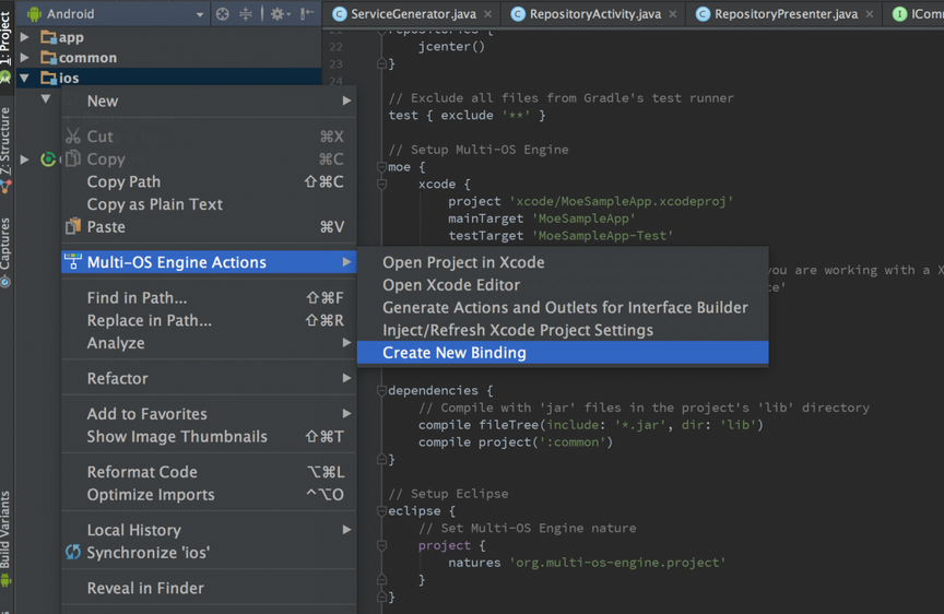Generate binding finished successfully. In ios module in java→{package}→src there is generated file, called RepositoryListViewController.java . Inside them we can see generated native Objective-C methods. Android Studio tagged them as errors, but they are only warnings and might be ignored. Here we will write all Java code responsible for UI behaviors.